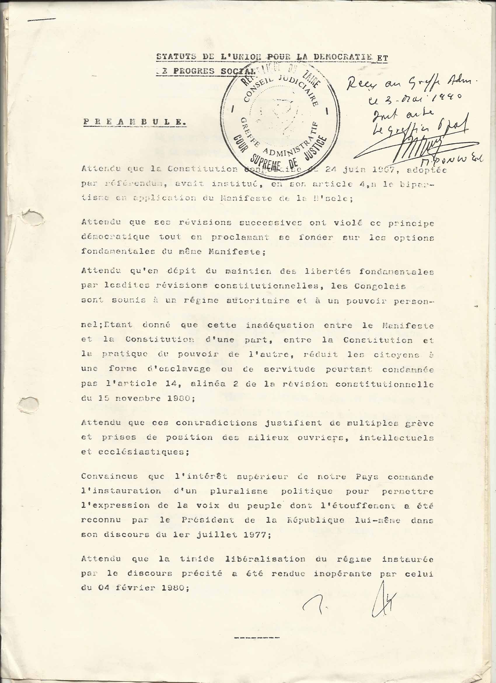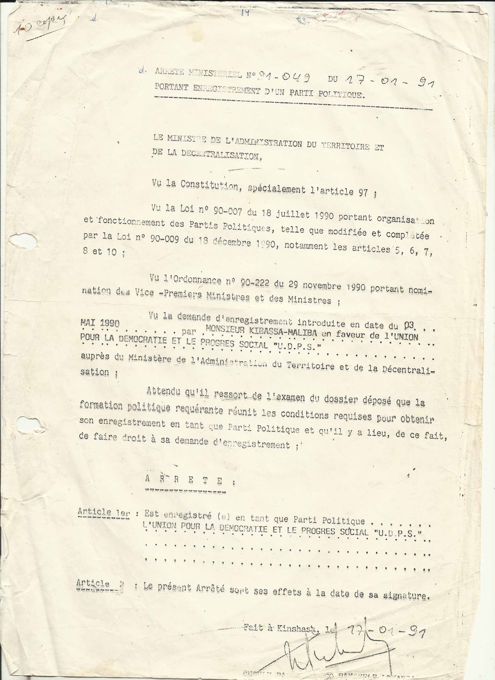 Conformément au discours de Monsieur le Président de la République en date du 24 avril 1990 instaurant le multipartisme et en attendant la promulgation de la loi devant en réglementer l’application, nous avons l’honneur de rappeler à votre aimable attention la demande d’agrément de notre Parti Politique, UNION POUR LA DEMOCRATIE ET LE PROGRES SOCIAL (UDPS) déposée au Ministère de l’Intérieur en date du 15 février 1982.