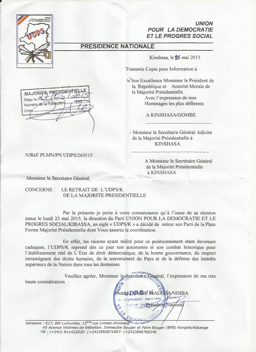 Ci-dessous, la lettre du Président National Protais  LUMBU  MALOBA  NDIBA pour ce retrait.