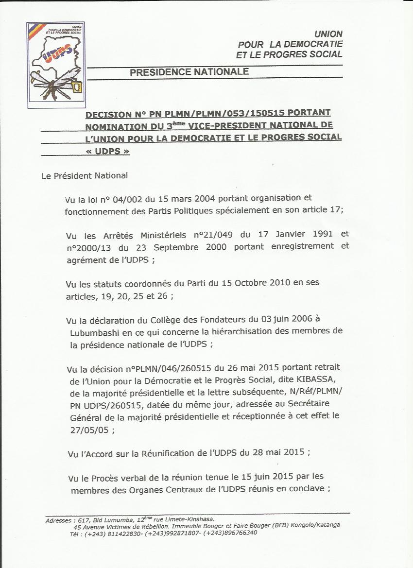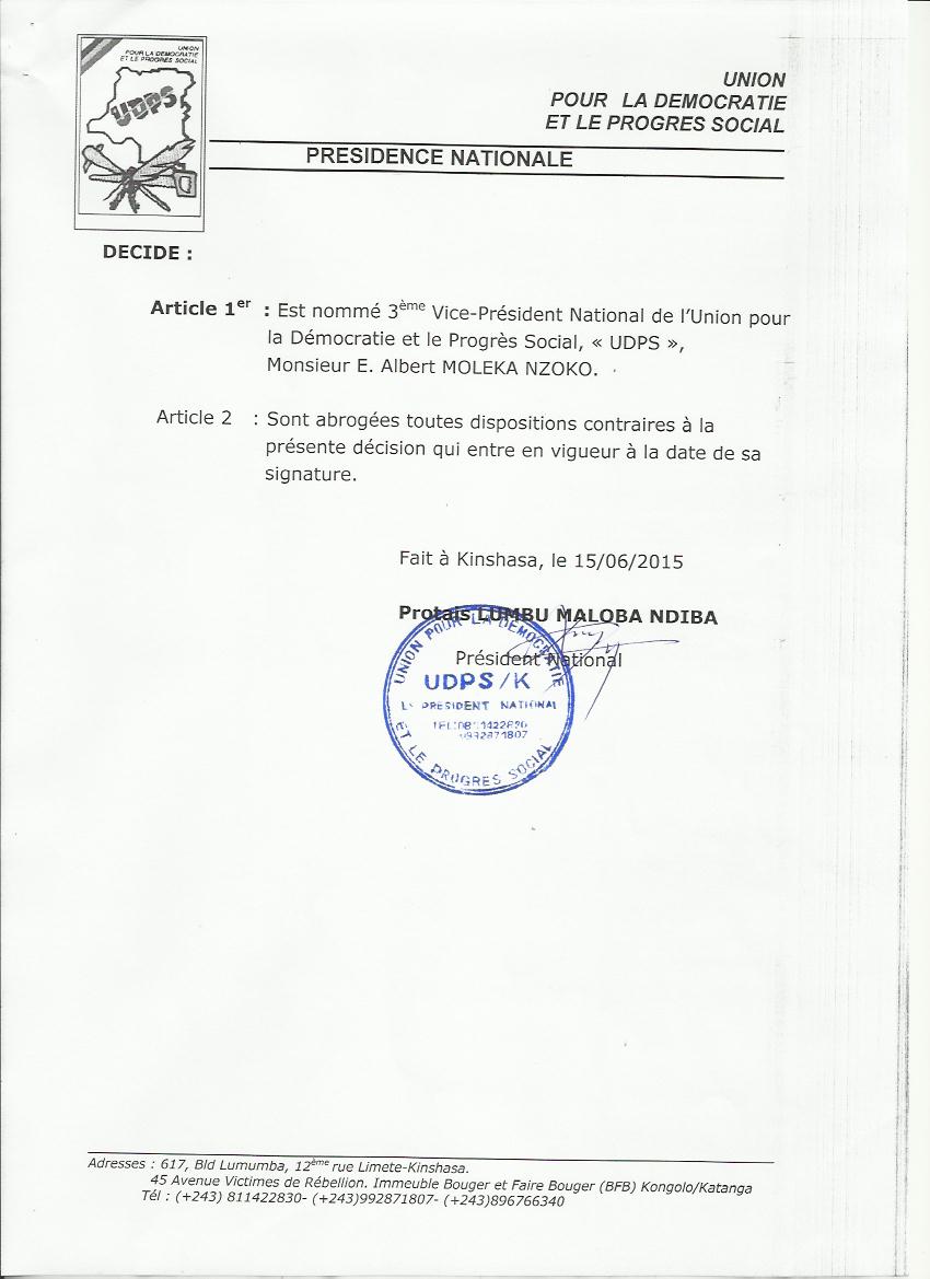 Le Conclave de l’UDPS a investi E. Albert MOLEKA NZOKO en qualité de 3ème Vice Président National de l’UDPS. Ci-dessous la décision 053