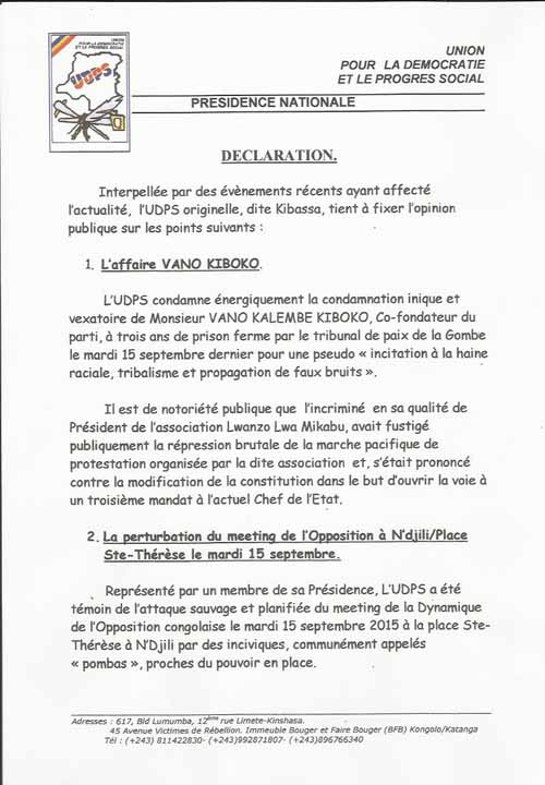 L’UDPS s’insurge contre la condamnation de Vano Kiboko, la perturbation du meeting de l’opposition et prend note de la déclaration du G7. Ci dessous sa déclaration: