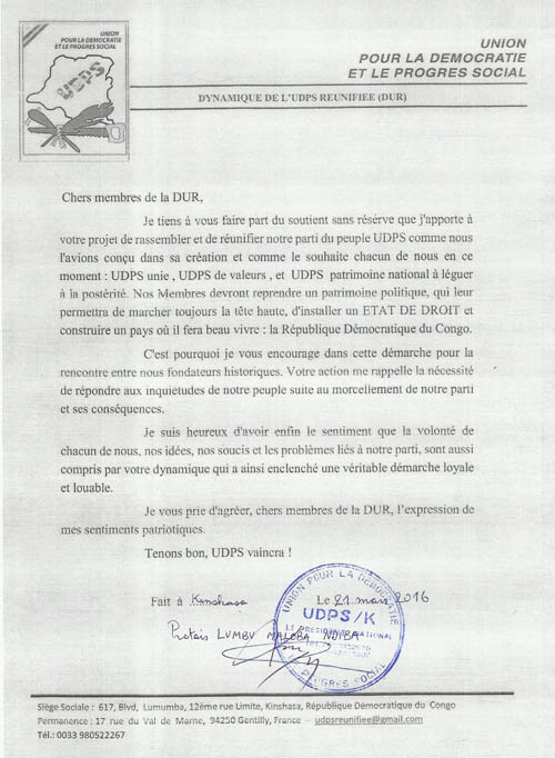 Le Président National de l’UDPS, Protais LUMBU MALOBA NDIBA soutient la Dynamique de l’UDPS Réunifiée « DUR »
