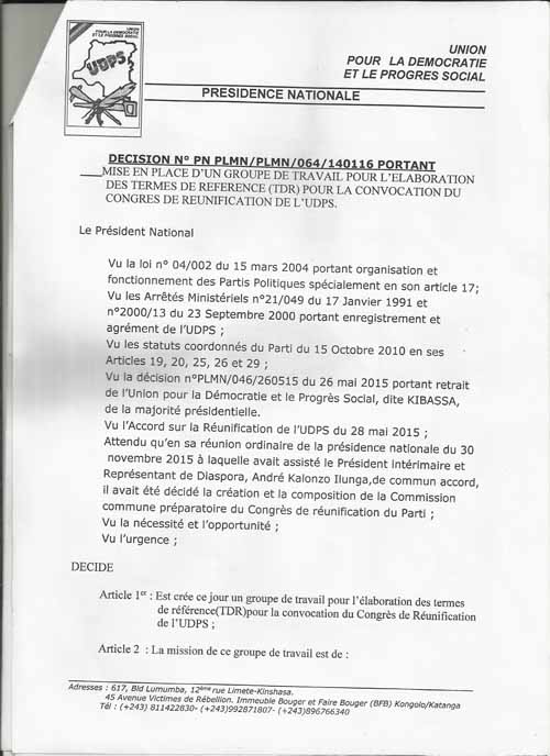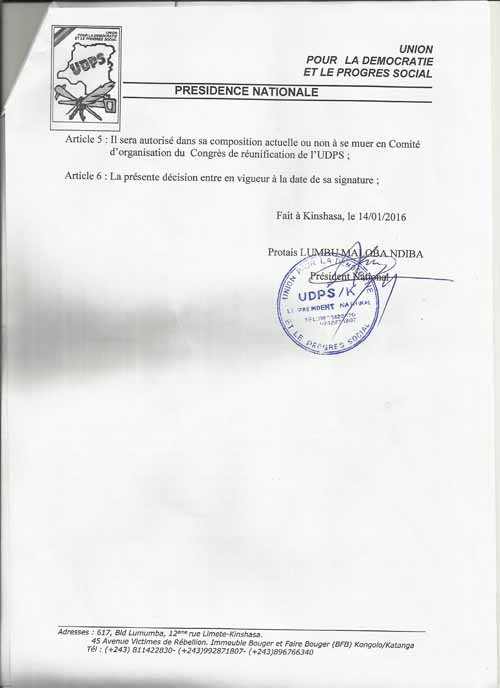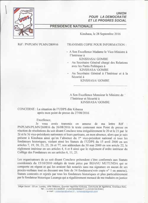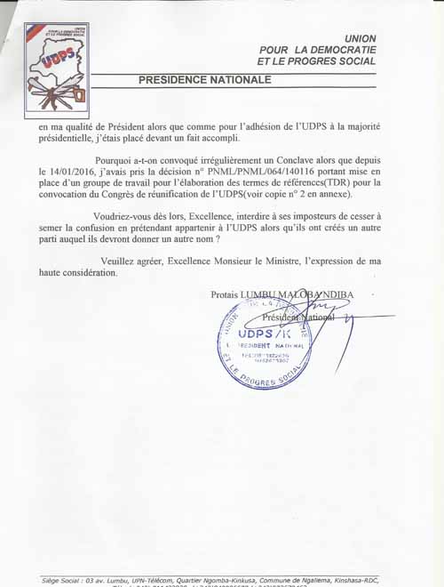 Jimmy Mukendi en publiant que Protais Lumbu est usurpateur est -il informé de la lettre PLMN/280916 de ce dernier au MININTER dont voici la teneur et ses annexes ?